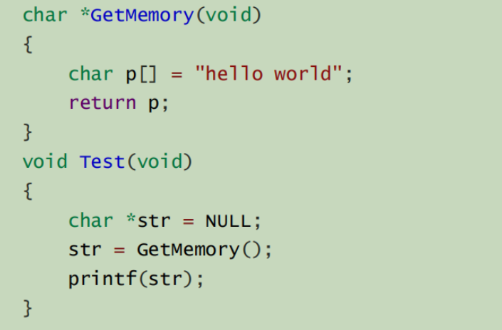 这里是把字符串放在字符数组中,出了函数p就销毁了,而str是指向p首元素的指针。但是p销毁了,str就变成野指针了。