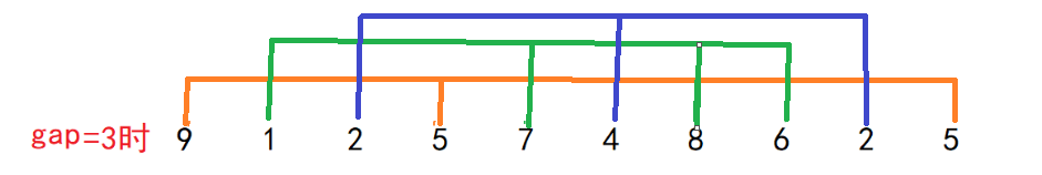 当gap = 3时,我们可以把一组数据分为3组,每一组中,单独进行排序。通过这样,我们可以让数据大致趋向于有序。这就是单趟的底层原理了。