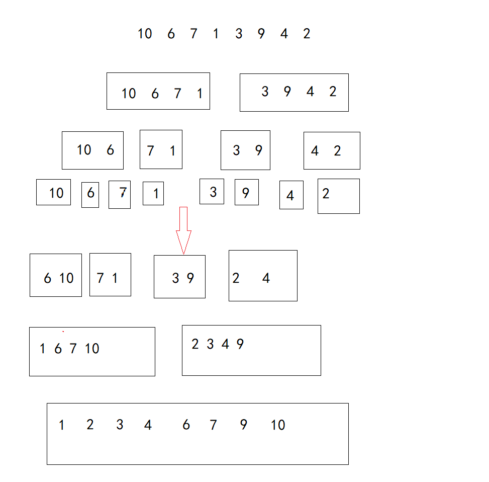 归并排序(MERGE-SORT)是建立在归并操作上的一种有效的排序算法,该算法是采用分治法(Divide and Conquer)的一个非常典型的应用。将已有序的子序列合并,得到完全有序的序列;即先使每个子序列有序,再使子序列段间有序。若将两个有序表合并成一个有序表,称为二路归并。 归并排序核心步骤:分解、合并。