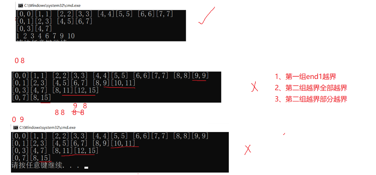 1、第一组的end1越界了。
