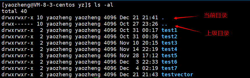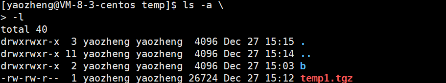 ls -a:加上 -a 的话可以显示所有的文件,包括隐藏文件也就是 . 开头的文件。(选项的字母是可以一起输入的,例如 -l -a 可以输入 -la)