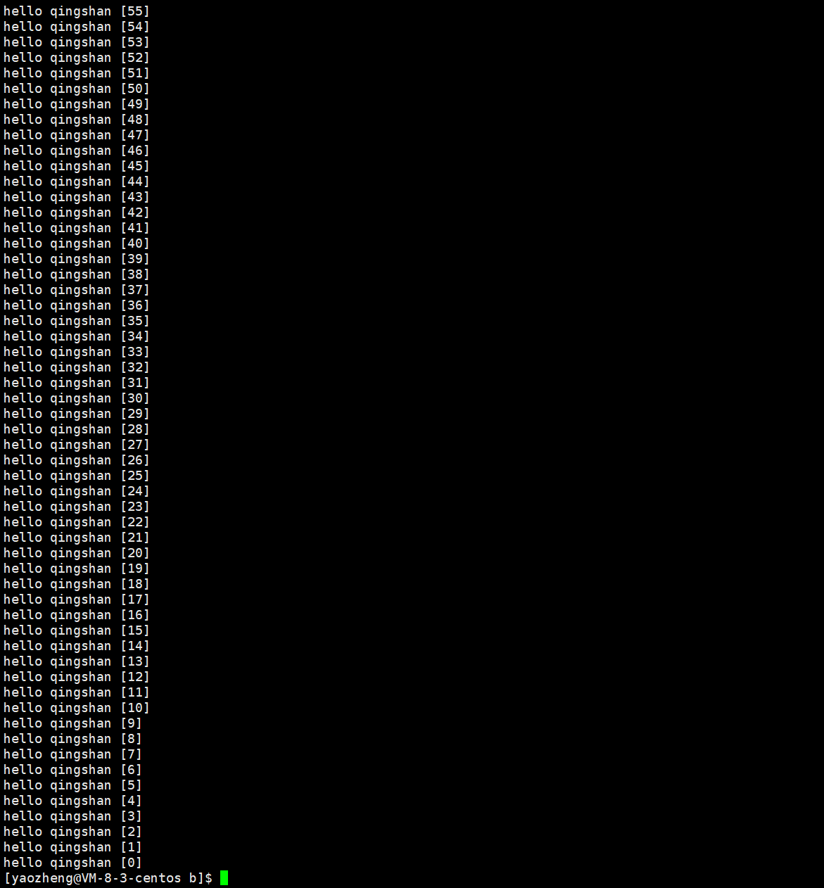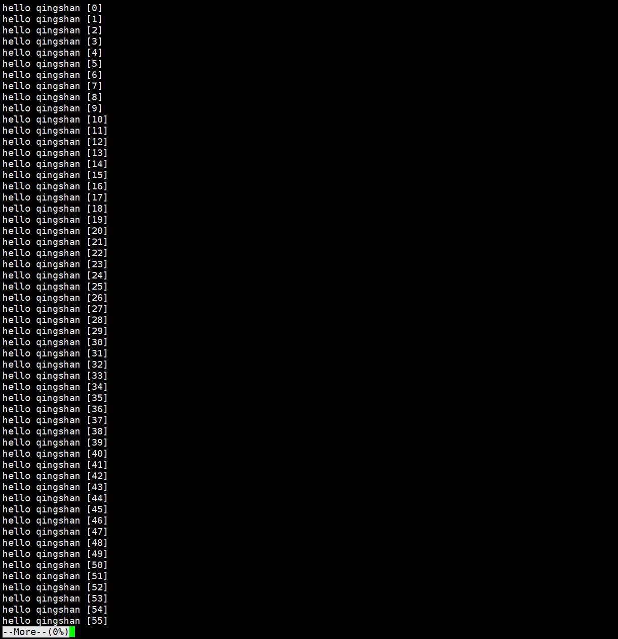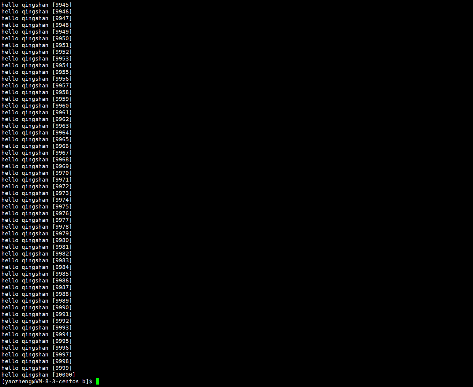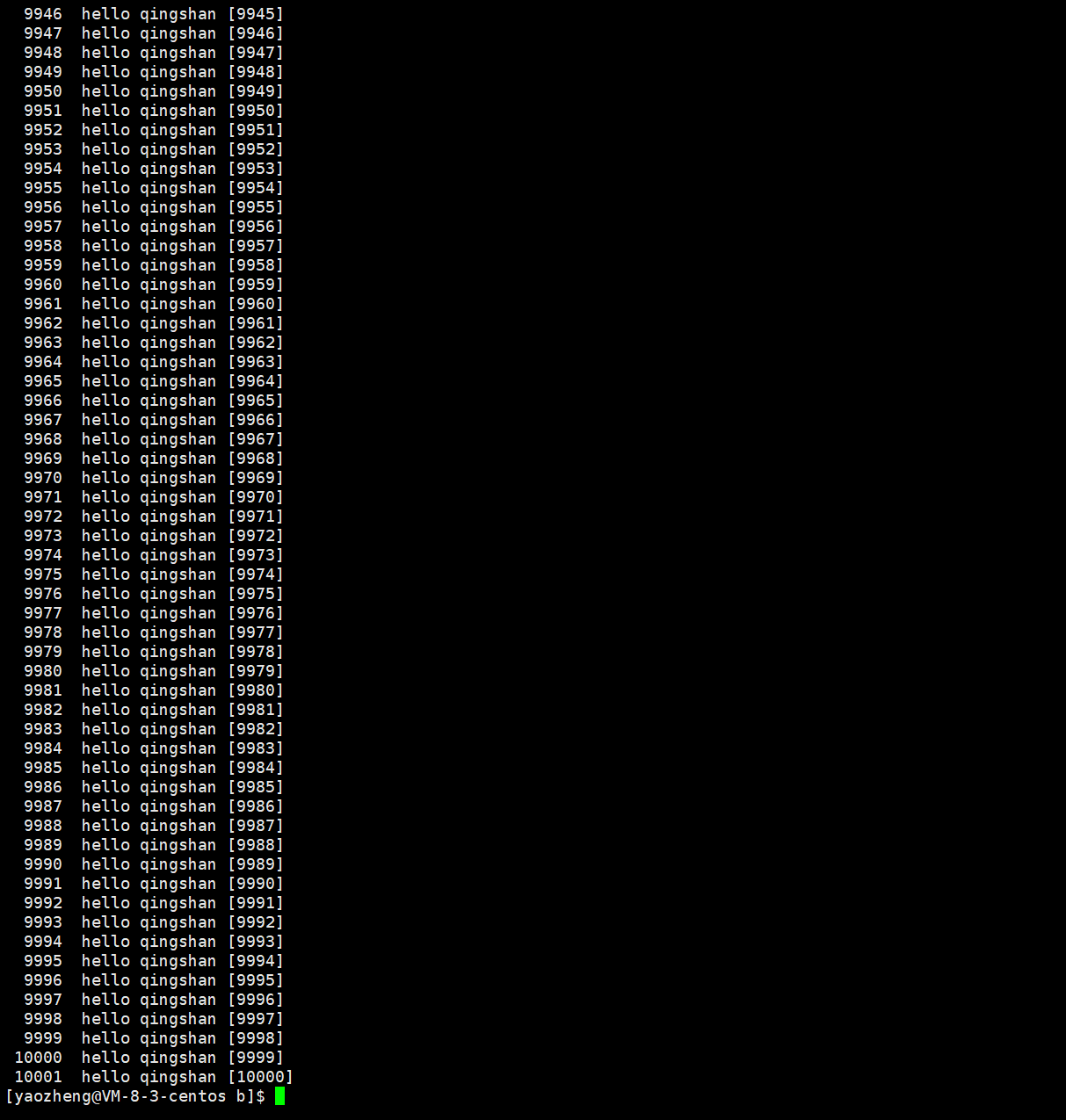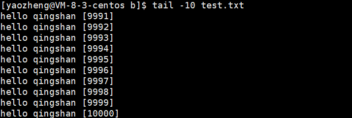 我们输入:cnt=0;while [ $cnt -le 10000 ] ; do echo "hello qingshan [$cnt]"; let cnt++; done > test.txt 后,会发现出现了一个很大的文件 test.txt