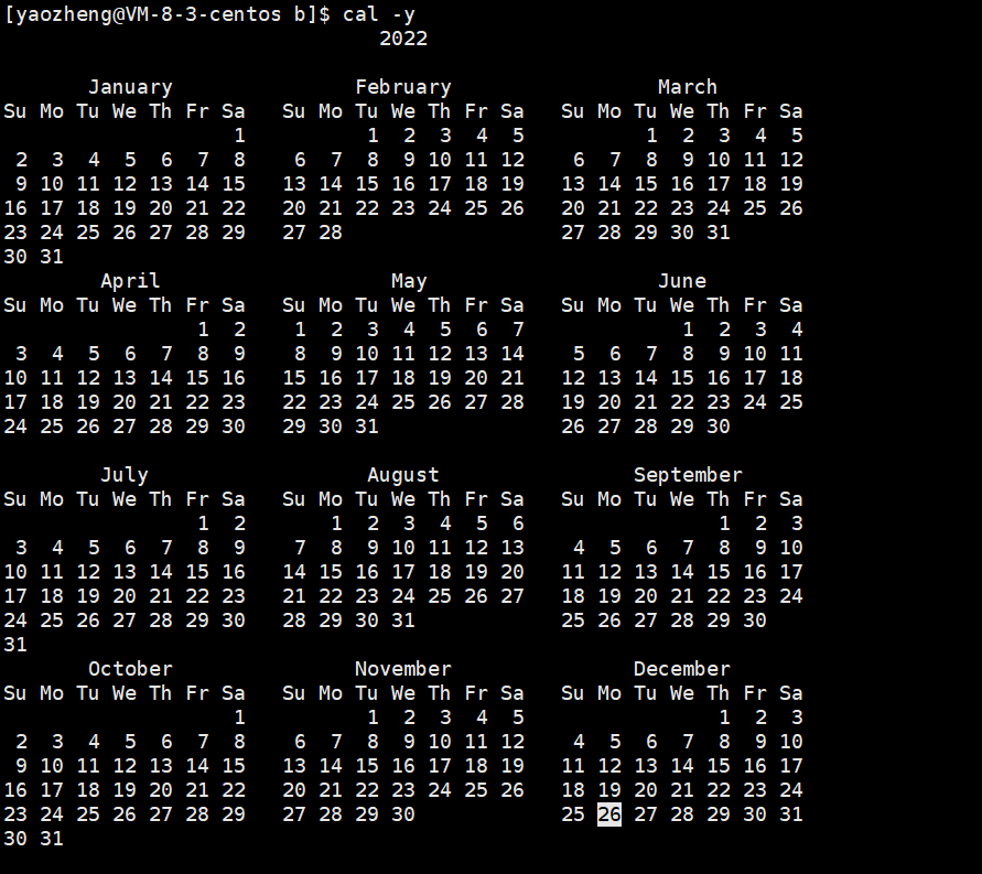 cal 命令可以用来显示公历(阳历)日历。公历是现在国际通用的历法,又称格列历,通称阳历。 “ 阳历 ” 又名 “ 太阳历” ,系以地球绕行太阳一周为一年,为西方各国所通用,故又名 “ 西历 ” 。