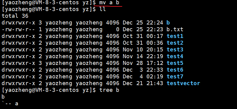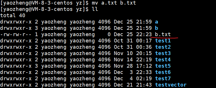 2. 当第二个参数类型是文件时, mv 命令完成文件重命名,此时,源文件只能有一个(也可以是源目录名),它将所给的源文件或目录重命名为给定的目标文件名。