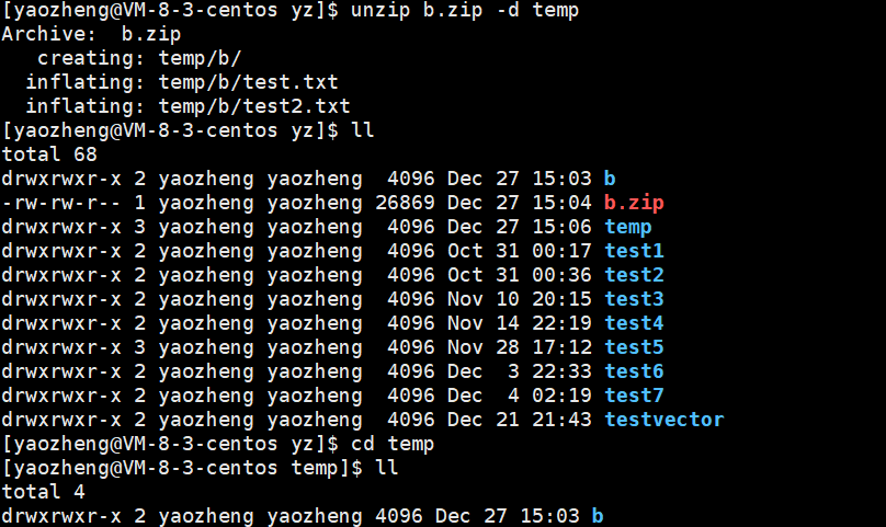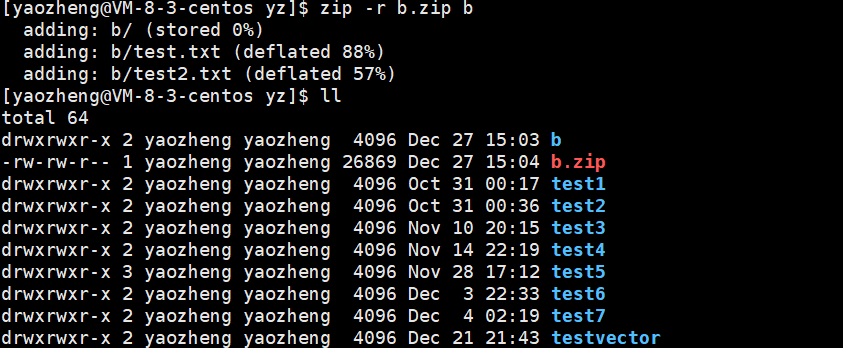 这个命令是没有默认安装的,我们需要安装,在命令行输入:yum install -y zip unzip