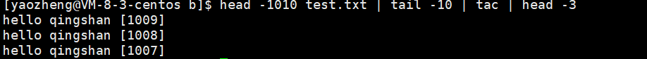 这时候我们只需要输入:head -1010 test.txt | tail -10 | tac | head -3