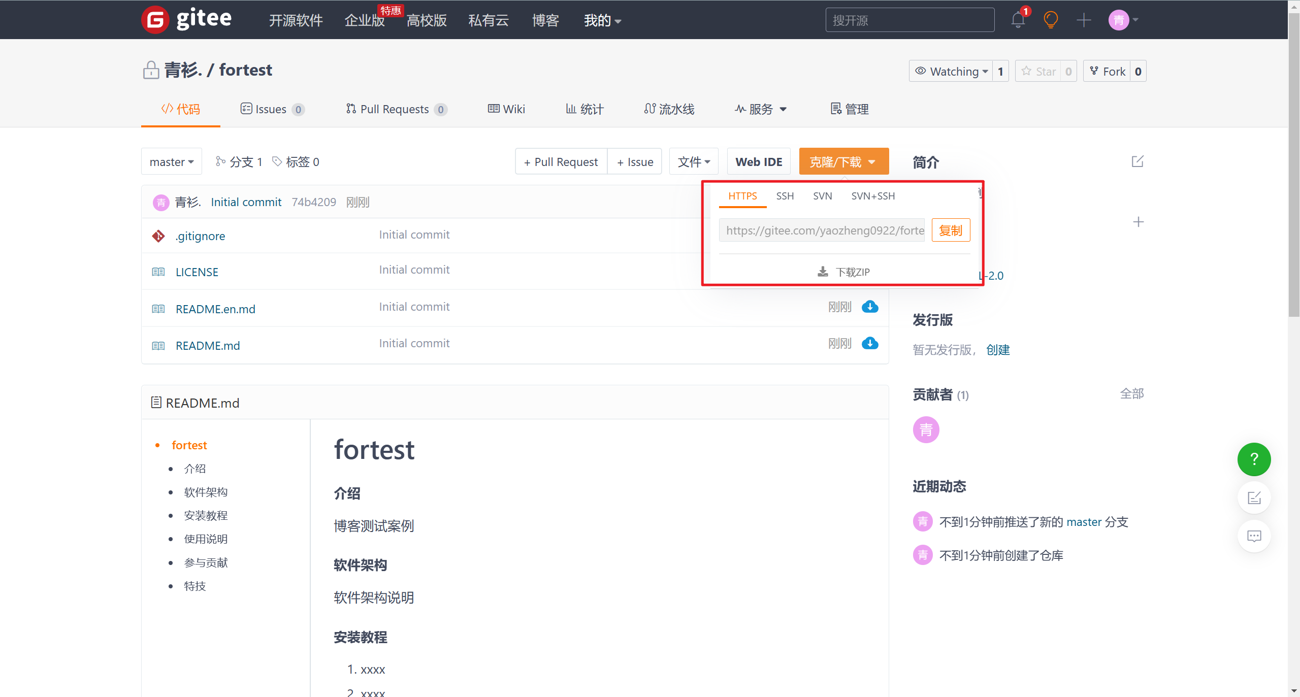 选择好语言,开源许可证随便选一个即可,模板我们最好设置一个Readme文件,方便后面写明仓库的介绍。 分支模型我们新手选一个单分支模型就可以了。 因为仓库创建的时候只能选择私有,我们如果要设置开源还需要创建好之后去设置。