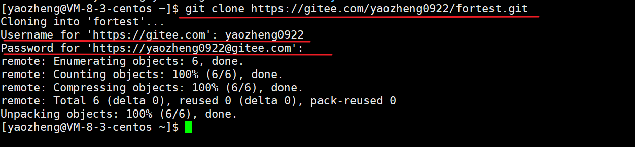 到我们的Linux环境下输入:git clone [仓库地址] (第一次使用git可能需要下载,输入:sudo yum install -y git)