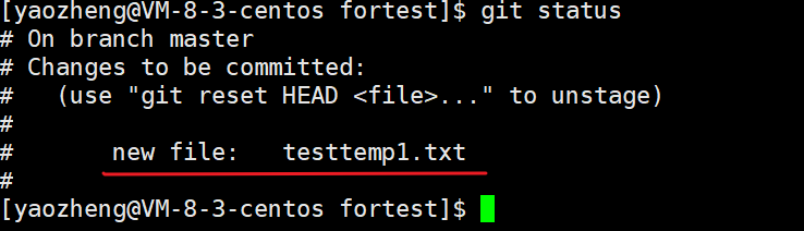当我们把我们想要提交的文件放入仓库之中后,我们在命令行输入:git add . ( . 是提交当前路径所有文件,如果指定提交某个文件的话(例如文件 test.txt),我们可以输入 git add “test.txt”) 我们输入 git status 查看,可以看到这里显示有了新文件,说明我们添加了提交了新文件。