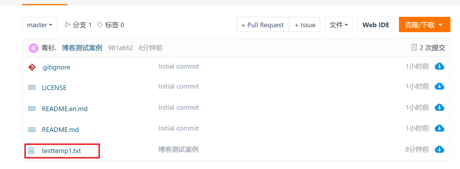 我们本地仓库提交完了,还需要用 push 提交到远程仓库。 我们输入:git push 这时候我们看到远程仓库里面就会有我们提交的文件了。