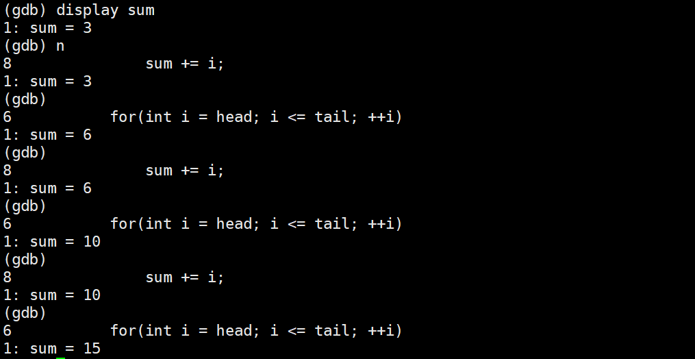 - display 变量名:跟踪查看一个变量,每次停下来都显示它的值