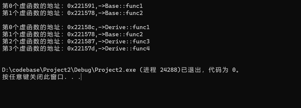 printf("第%d个虚函数的地址:0x%x,->", i, vTable[i]);