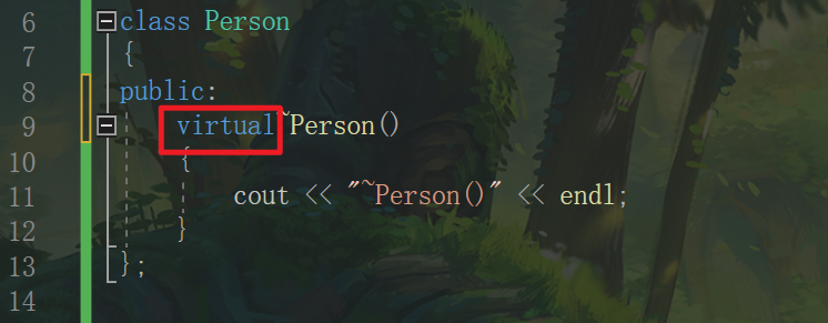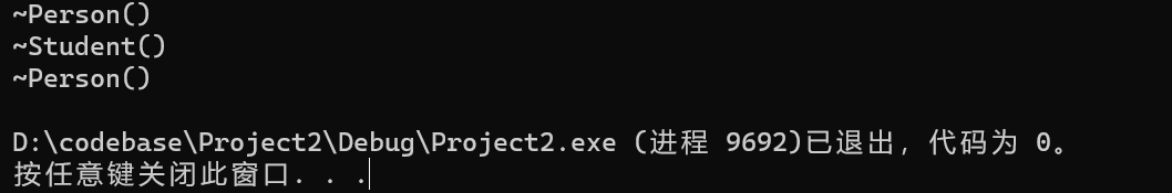 }我们发现,当我们用Person指针指向子类的时候,用的析构函数仍然是父类的。但是当我们给父类析构函数加上 virtual 。析构的时候就会调用子类的析构函数了。这是因为不加 virtual 的时候,析构函数是普通调用,而加上了 virtual 之后就变成了多态调用。具体的底层原理我们等下介绍虚函数表的时候会说明。