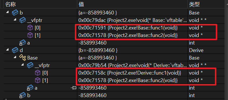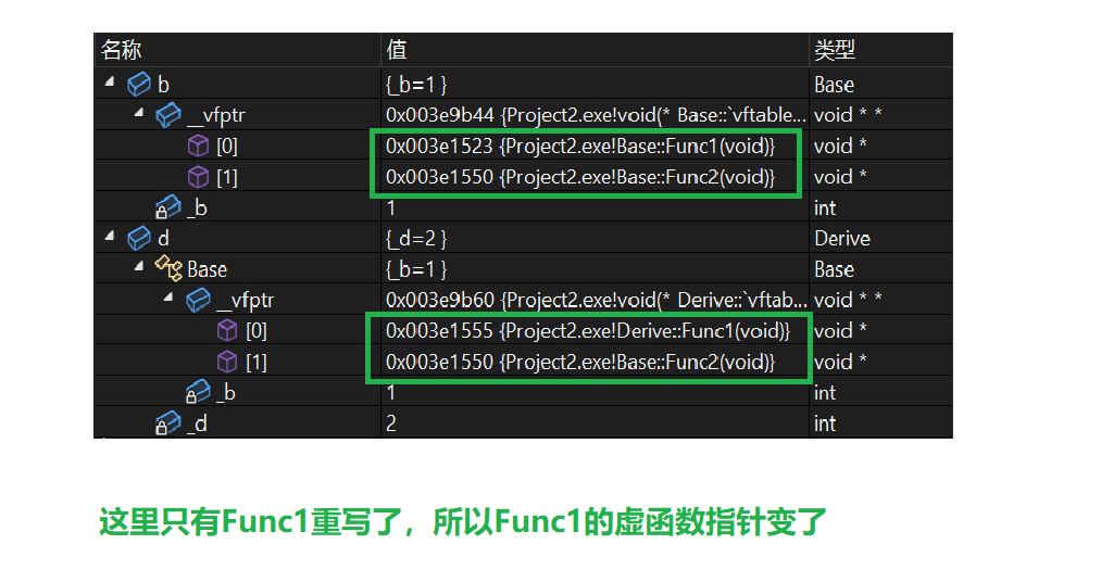 2. 基类 b 对象和派生类 d 对象虚表是不一样的,这里我们发现 Func1完成了重写,所以d的虚表中存的是重写的Derive::Func1,所以虚函数的重写也叫作覆盖 ,覆盖就是指虚表中虚函数的覆盖。重写是语法的叫法,覆盖是原理层的叫法。
