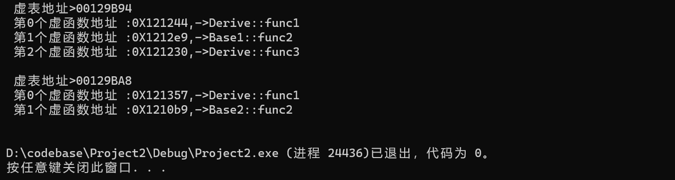 我们看到派生类中没有重写的虚函数是存放在了第一个继承的基类的虚表中的。派生类的函数一般是按照函数声明顺序来排列。