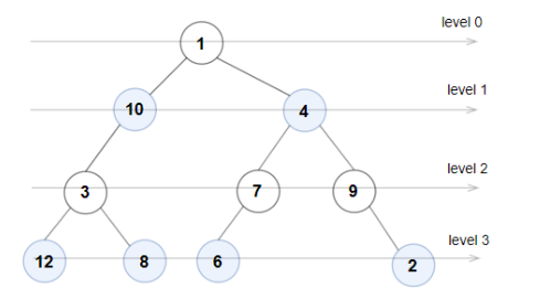 输入:root = [1,10,4,3,null,7,9,12,8,6,null,null,2] 输出:true 解释:每一层的节点值分别是: 0 层:[1] 1 层:[10,4] 2 层:[3,7,9] 3 层:[12,8,6,2] 由于 0 层和 2 层上的节点值都是奇数且严格递增,而 1 层和 3 层上的节点值都是偶数且严格递减,因此这是一棵奇偶树。