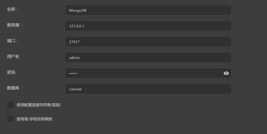 ① 连接数据库 runoob 中必须有admin 这个账号,MongoDB创建创建数据库后,要给添加用户访问权限,否则是登录不上的。