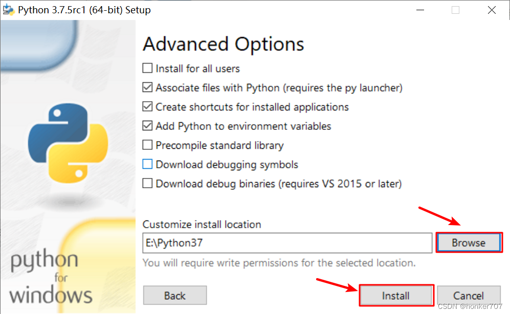 :不做更改点击Browse选择你新建的Python37文件夹,确认无误后点击Install