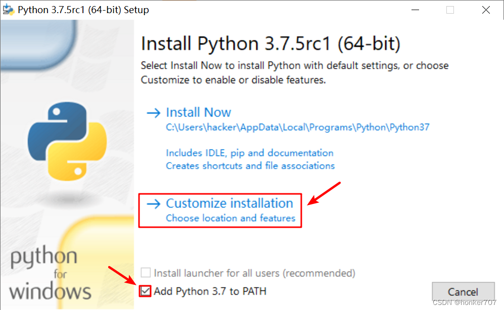 文件夹(这里我在E盘新建了Python37文件夹) 一定要勾选Add Python 3.7 to PATH(不勾选需要自己添加环境变量)