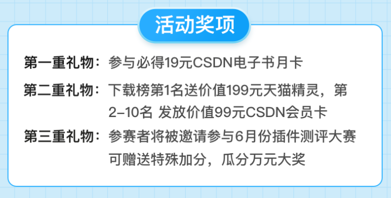 5、大赛评选:组委将根据 05 月 24 日的插件下载量、脚本质量和对 CSDN 生态的贡献值进行打分,根据排名进行发奖
