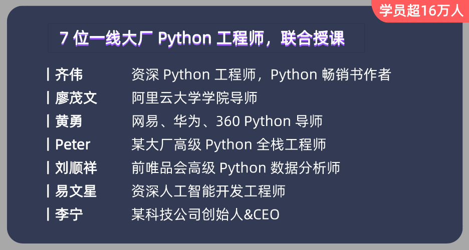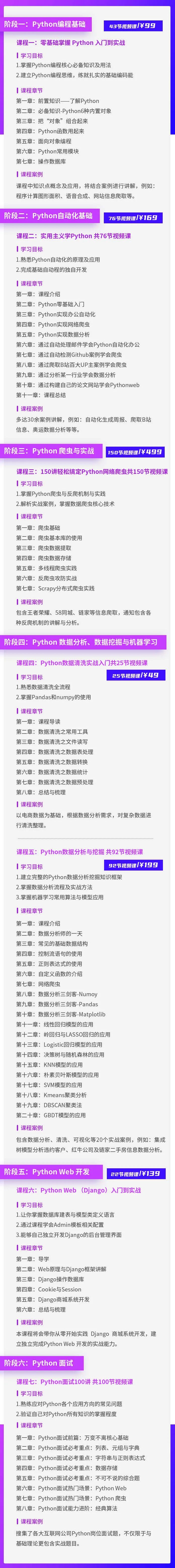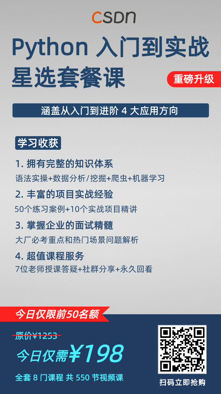 这个教程是 CSDN 经过深度调研大厂对于 Python 工程师的招聘需求后,联合 7 位一线工程师,专为想掌握 Python 技能的开发者们打造而成,截止目前已经累计了16w+的学员学习。