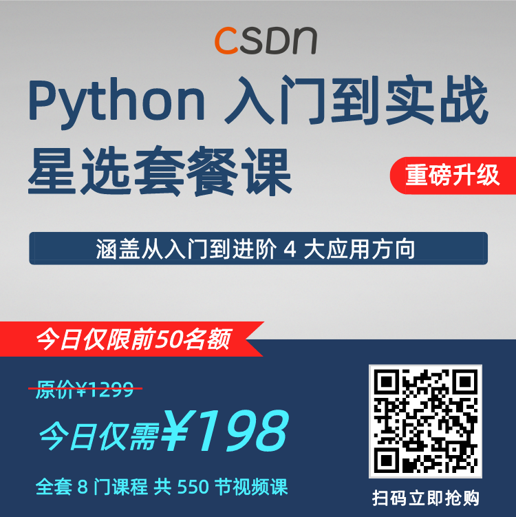 当然,这都不是一蹴而就的,更有效的方式是找到一份知识体系全面的教程跟着学。这里推荐CSDN亲自研发的《Python入门到实践一卡通》视频教程,包含了从入门到进阶4大应用方向的内容,助你从零建立Python工程师必备的知识体系,满足不同应用方向的学习需求。