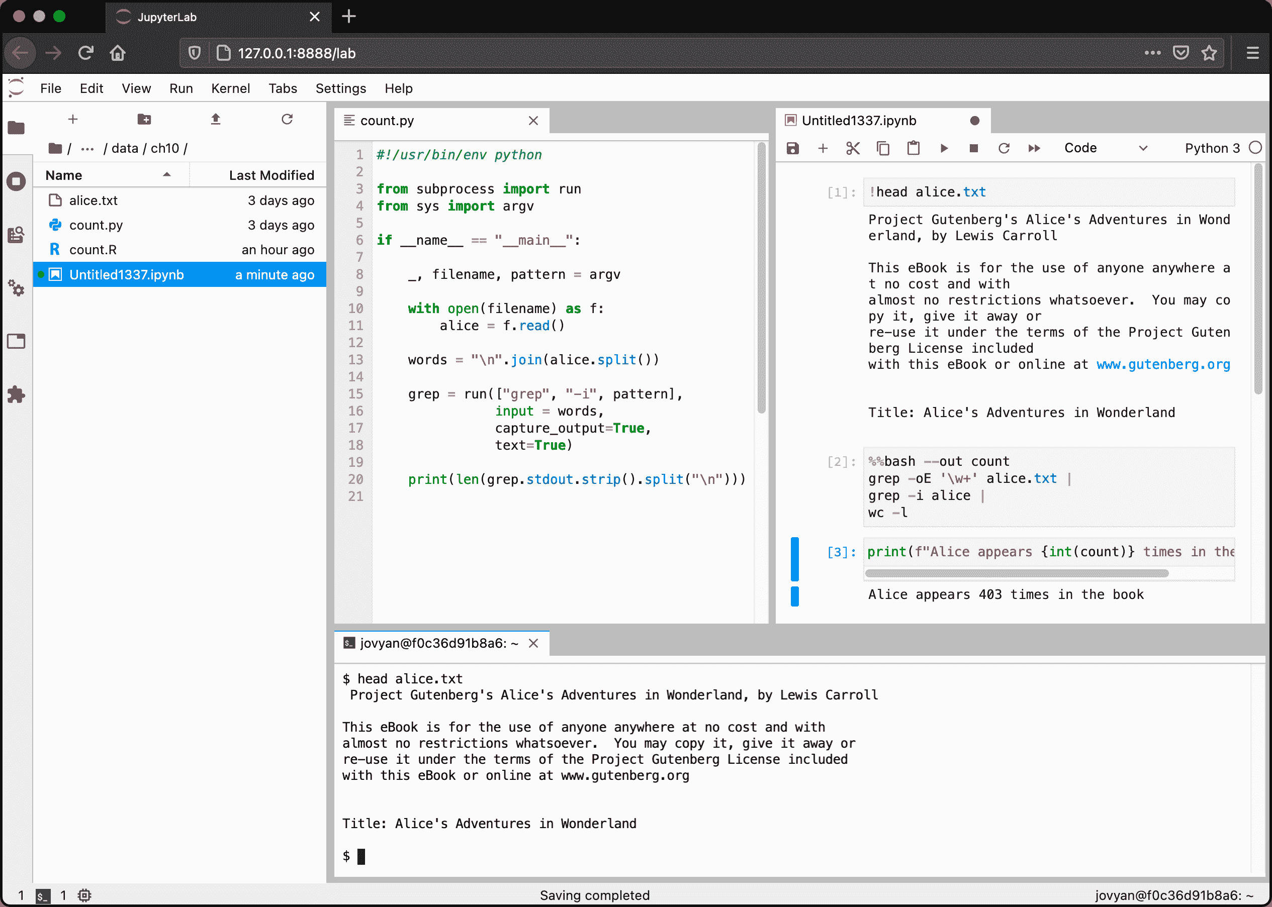 图 10.1 是 JupyterLab 的截图,显示了文件浏览器(左)、代码编辑器(中)、笔记本(右)、终端(下)。后三者都展示了利用命令行的方法。代码是我将在下一节讨论的内容。这个特殊的笔记本与我刚才讨论的控制台会话非常相似。终端为您运行命令行工具提供了一个完整的 Shell。请注意,这个终端、代码和笔记本之间不可能有交互。因此,这个终端与打开一个单独的终端应用没有什么不同,但是当您在 Docker 容器内或远程服务器上工作时,它仍然很有帮助。