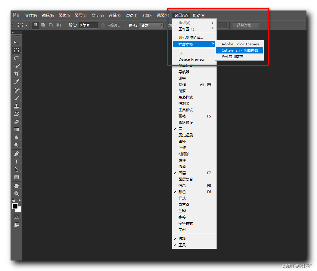 重启 Photoshop 软件 , 选择 " 菜单栏 / 窗口 / 扩展功能 / Cutterman - 切图神器 " 选项 ;