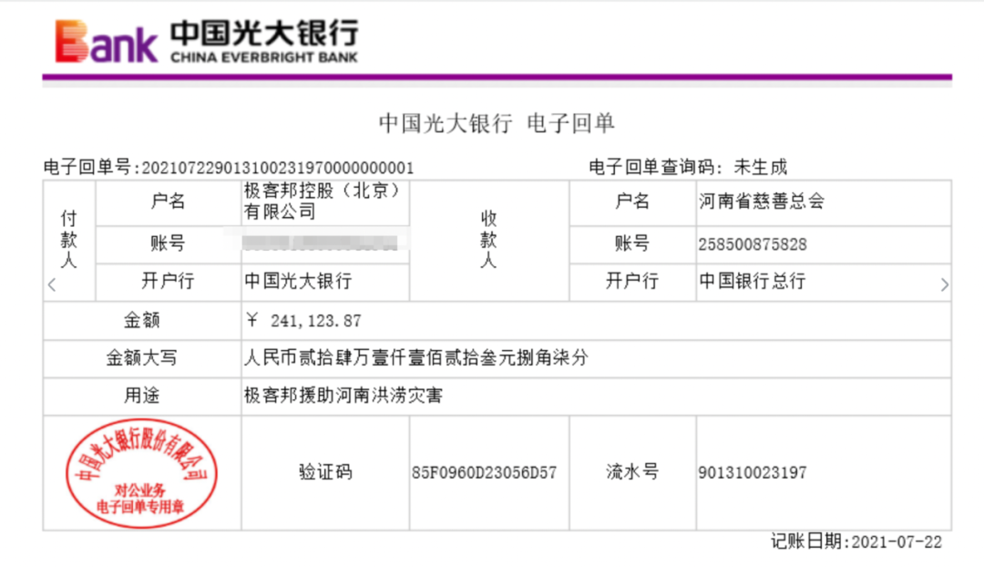 极客邦科技本次通过河南省慈善总会向河南灾区捐赠 241,123.87 元,用于保障当地群众人身安全和紧急采购救灾物资。