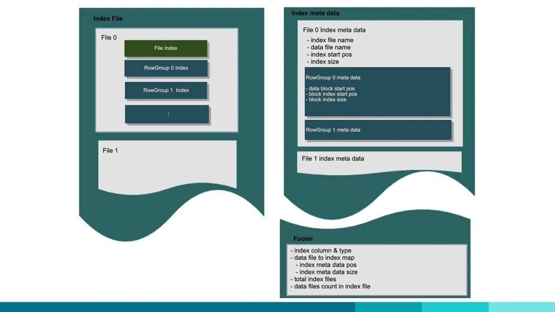 索引数据由两部分组成:索引文件和索引元数据文件。为了避免过多的 HDFS 小文件,为一组数据文件创建一个索引文件,索引元数据文件描述了索引文件。索引文件和元数据文件的格式如下: