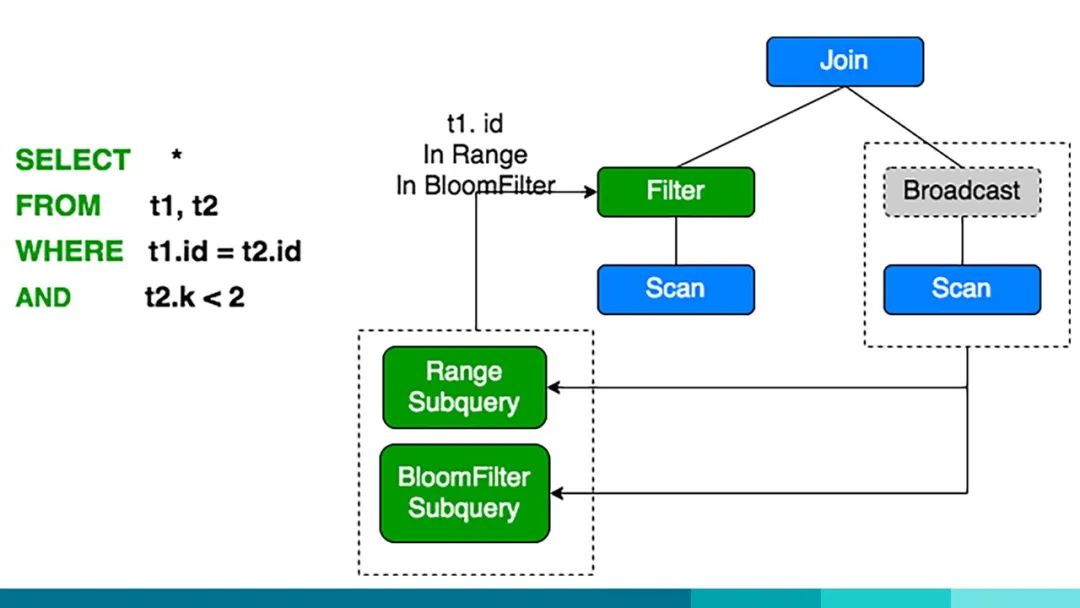 为了提高查询性能,新的 SQL-on-Hadoop 引擎也实现了运行时过滤器。这个实现类似于 DPP。当一个大表与一个小表进行 Join 时,从小表收集结果和统计数据,并用于扫描大表,以便在执行 Join 之前执行数据过滤器。这在某些情况下可以极大地减少 Join 记录。在下面的图 3 中,你可以看到示例说明:
