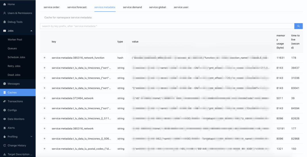 一个常见的场景是,数据库中的数据更新了,却不能很清楚地知道数据何时能生效,在定位问题时很容易导致判断错误。在这个模块中,我们将缓存数据进行了可视化展示,提供搜索功能以针对特定的 key 进行查询,用户可以很清楚地看到有哪些数据被缓存,数据量多大,到期时间等等。如下图展示了 Metadata Service 中当前缓存的业务数据情况。