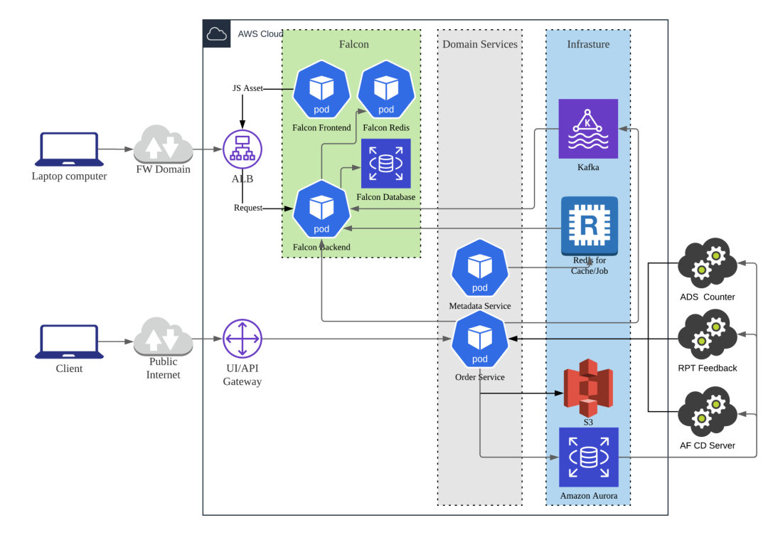 我们将 Falcon 前端 /Falcon 后端 /Redis 打包,以 Kubernetes Pod 的形式运行部署,和 FreeWheel 的业务微服务部署在同一个 AWS EKS 集群中,而数据库使用了 AWS RDS 服务来支持。我们对 Falcon 前端 /Falcon 后端 / 数据库暴露了 VIP,FreeWheel 内网进来的请求,会先经过 AWS ALB,转发到服务网格 Ingress Gateway,最后打到 Falcon 对应的 Pod 或数据库。