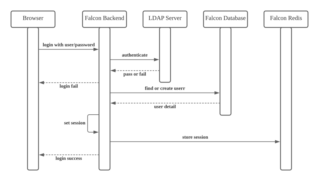 出于系统平台安全性的考虑,我们限定了只有在 FreeWheel 内网才可以访问 Falcon 平台。平台的使用用户限定在 FreeWheel 的工程师团队,而 FreeWheel 内部员工使用 LDAP 来做账号的统一登录认证,因此 Falcon 后端也集成了 LDAP 对登录用户认证。在用户首次登录时,Falcon 会将该用户同步存储在数据库中,以便之后为其配置在 Falcon 平台的用户权限。