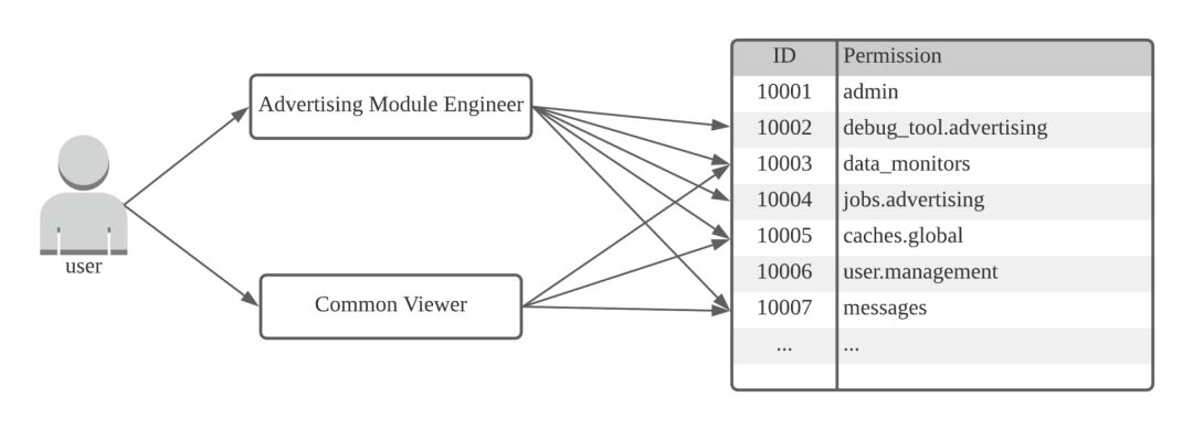 Falcon 平台的功能和架构定位,决定了它的重要性和影响程度远高于微服务。尽管平台致力于实现对于业务有保护性质的功能,但仍有必要对登录使用该平台的用户进行管理,以避免发生误操作造成严重影响。我们采用了通用的用户 - 角色 - 权限模式来进行用户的管理,每个功能模块都定义了读写权限,细化到微服务,在此之上按团队划分配置了工程师角色,只需要给不同用户以相应的角色,即对该用户在平台的操作权限进行了控制。如下图是给一个 Advertising 团队工程师的权限。