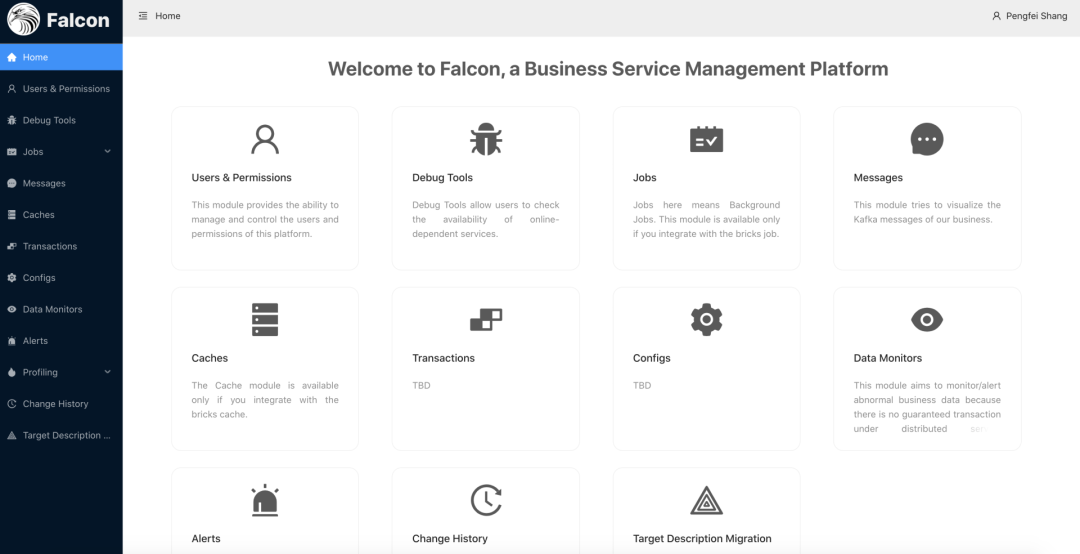 今天 Falcon 针对于业务团队的痛点实现了许多功能模块,还有一些功能模块正在探索和开发中,下图是 Falcon 的导航首页。