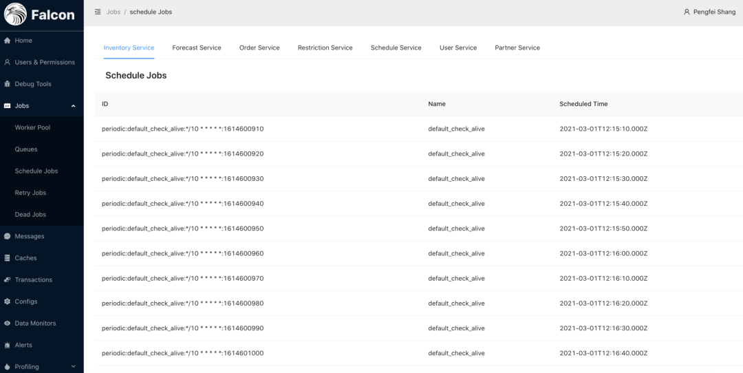 针对这一痛点,我们在 Falcon 中构建了后台任务的可视化模块,提供 5 个方面的内容:Worker Pool, Queue, Scheduled Job, Retry Job, Dead Job. 用户可以查看到正在执行的任务有哪些,队列中已有哪些任务,将要执行的定时任务分别安排在了什么时间,重新过的任务是哪些,哪些任务执行失败了等等。例如下图中展示了 Inventory Service 中每 10 秒执行一次的 default_check_alive 任务的排期情况。