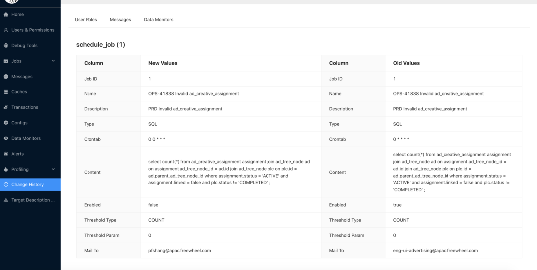 作为平台系统完整性的一部分,也为了更好地追踪平台上的设置更改,我们实现了使用记录模块,以记录在该平台上发生的所有更新操作。由于平台本身没有特别的复杂业务,同时更新不会特别频繁,因而在记使用记录时我们选择记录使用全量,而非变量,即当某个对象发生变化时,都将原始对象的快照进行全量备份。下图是某次更改设置的新值与旧值的对比,通过记录全量,我们能很清楚地看到某一时刻整个数据的状态,也能很容易地看到那些字段发生了变化。
