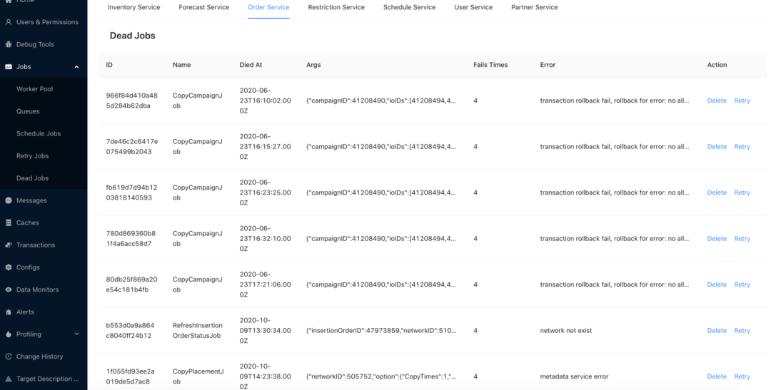 特别的,我们可能更关注于哪些任务执行失败了,以及失败原因,因此我们把失败任务的诸如参数、错误内容等详细信息展示出来,并提供了重试功能,以便在工程师在排查完错误原因后,可以手动触发重新执行任务。如下图展示了 Order Service 最近执行失败的任务、任务参数、失败原因等等。