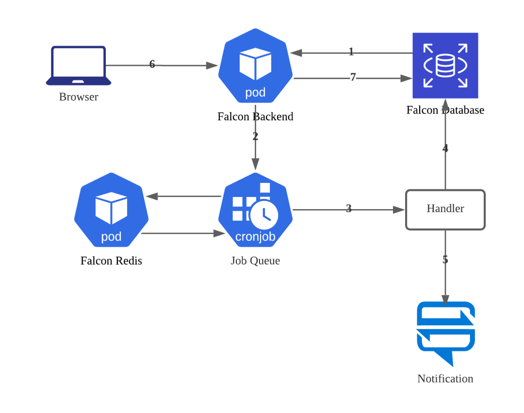 如上图所示,Falcon 后端在启动完成后,从数据库加载数据监控设置,初始化基于 Redis 的任务队列。任务队列中的任务根据设置好的排期,定时调用 Handler 执行 SQL 或调用接口,将执行结果写会到数据库。同时将执行结果与用户设置的参数进行比较,一旦发现满足脏数据条件,即进行报警通知订阅者。今天 Falcon 提供了 Email 和 Slack 两种方式进行报警通知。用户可以实时更改监控设置,Falcon 后端会将用户的实时更改持久化,并更新任务队列即时生效。