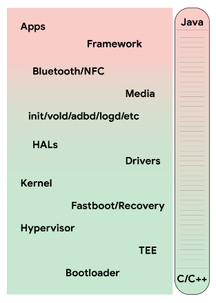 目前,Android 项目主要用两种语言构建。Java(以及最近出现的与 jvm 兼容的语言,如 Kotlin) 已被用于操作系统的上层部分,如 UI 部分;在内核、驱动程序等 OS 的基础层面,则通常用 C 编写,有时也会使用 C++。