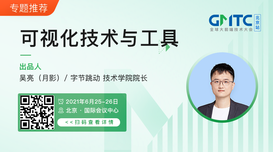 2021年 GMTC 全球大前端技术大会北京站,「可视化技术与工具专题」邀请可视化领域的技术专家,分享可视化技术在企业级应用和人们生活中的落地场景与技术沉淀。从实际使用场景出发,帮助你了解可视化的场景落地思路,了解复杂可视化工具的设计和实现,了解可视化技术发展趋势。