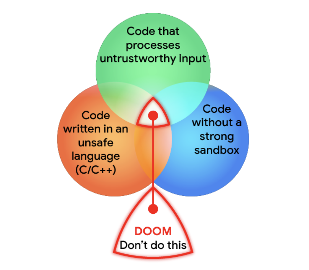 对 Android 来说,这意味着如果代码是用 C/C++ 编写并解析了不可靠的输入,则应将其放入一个严格受限和无特权的沙箱中。