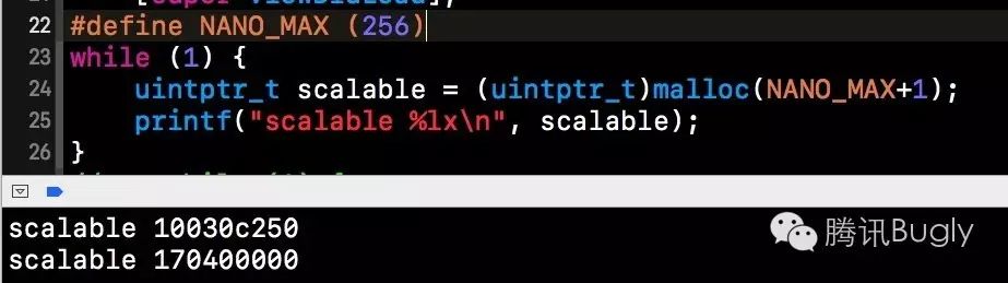 通过测试代码可以发现,小于256字节的指针确实在0x17段。然而,代码跑了一阵子之后,大于256字节的指针也落在了0x17段。