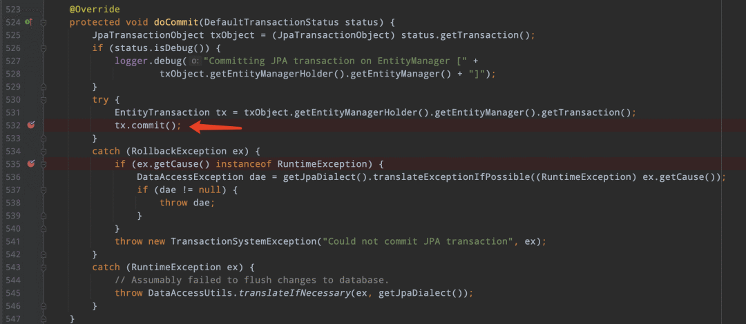test4中我们加的断点,除了47行没进入,其他的一次性都执行完了。然后才进入了org.springframework.orm.jpa.JpaTransactionManager的doCommit方法。