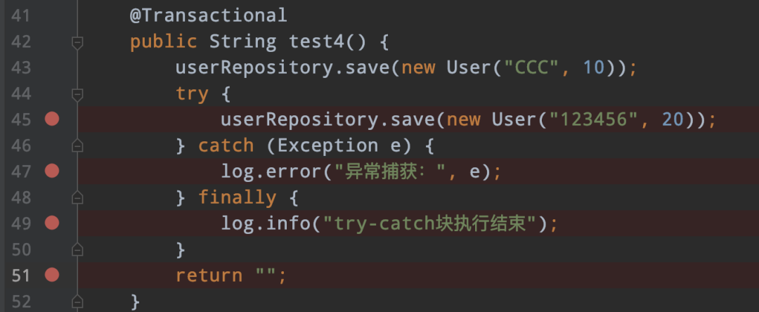 所以,前文中我们跟踪的事务回滚所抛出的异常,其实是在test4中的try-catch块执行完之后才抛出的,所以内部的这个catch是无法捕获异常的,这里完全就是catch了个寂寞。