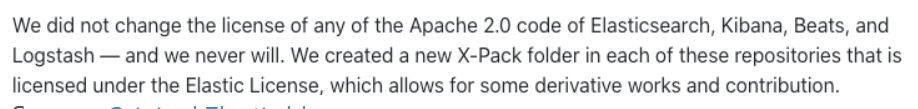 最后,Logz.io公司相信,在Apache2下合作提供Elasticsearch和Kibana开源,对Logz.io公司的客户来说是正确的。对于任何依赖这些开源项目的人来说,这是正确的做法。最重要的是,Logz.io公司认为这对开源软件的未来是正确的。(潜台词:白嫖用户来关心开源软件的未来了!)