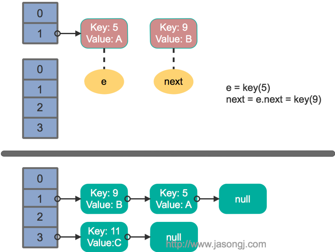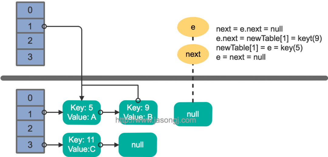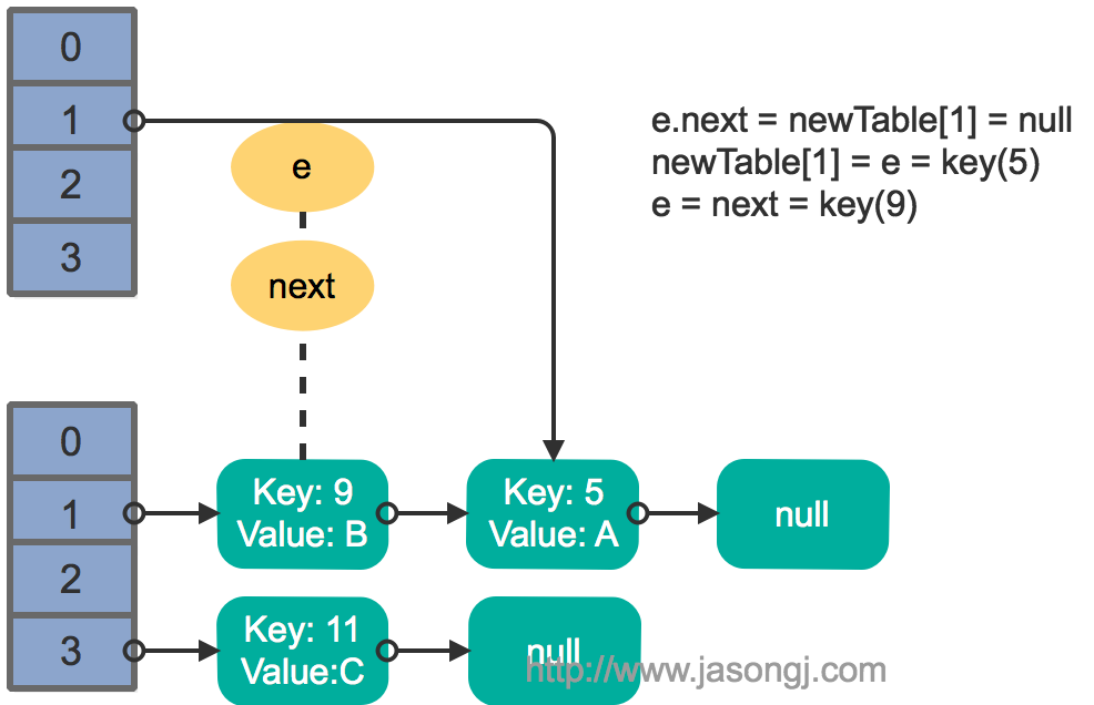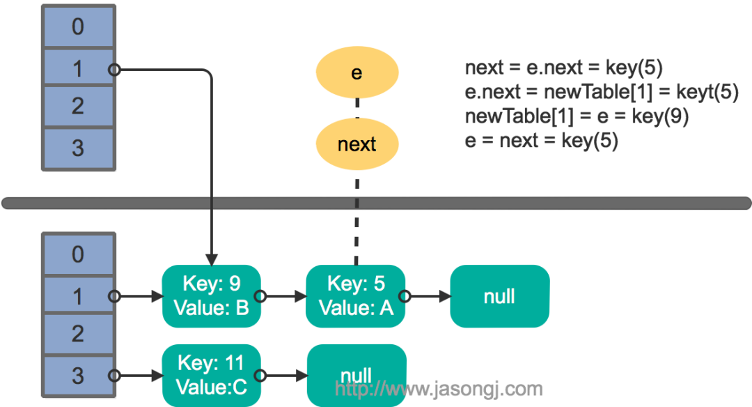 // 即 扩容后,可能出现逆序:按旧链表的正序遍历链表、在新链表的头部依次插入