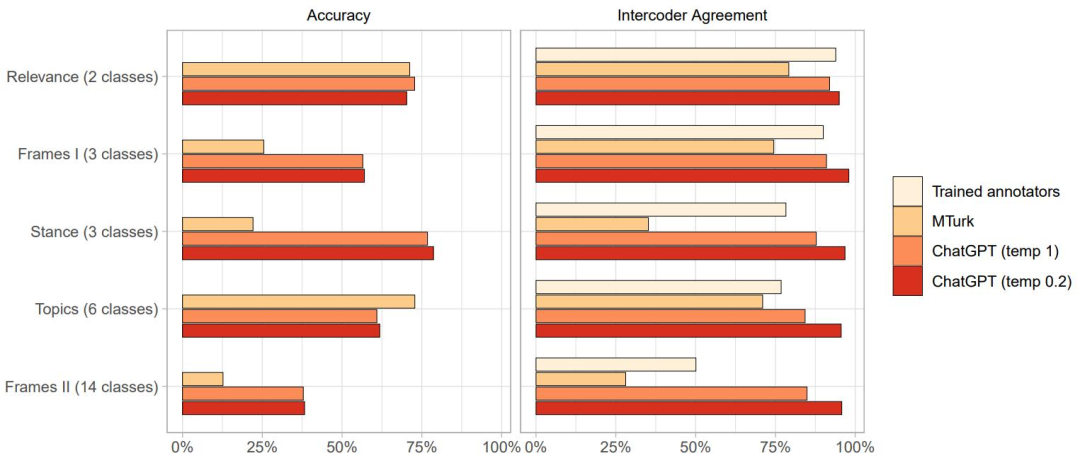 然后,研究人员使用 ChatGPT 和在 MTurk 上招募的众包工作者进行了这些完全相同的分类。对于 ChatGPT 进行了四组标注。为了探索控制输出随机程度的 ChatGPT 温度参数的影响,这里使用默认值 1 和 0.2 进行注释,这意味着随机性较小。对于每个温度值,研究人员进行了两组注释来计算 ChatGPT 的编码器协议。