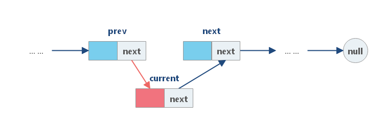 如果我们想从双链表中删除一个现有的结点 cur ,我们可以简单地将它的前一个结点 prev 与下一个结点 next 链接起来。
